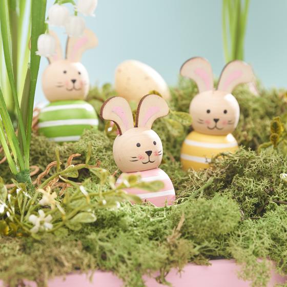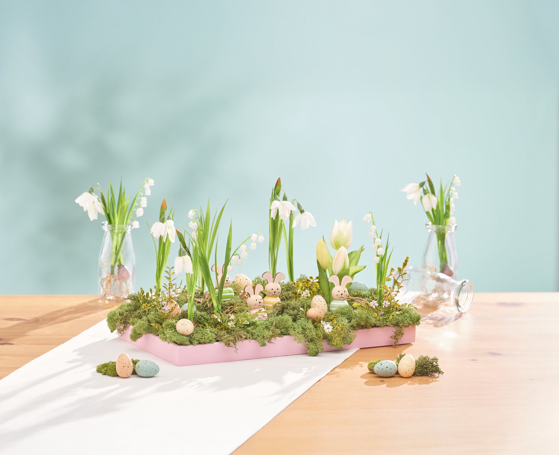 3. décoration de Pâques Placez des petits œufs de Pâques et des lapins dans l'arrangement. Pour que tout tienne bien, fixez-les ainsi que les petites fleurs individuelles avec un peu de colle chaude.
