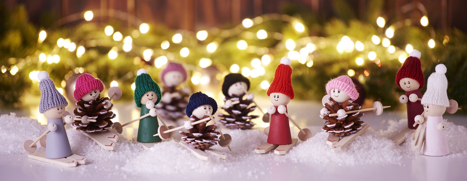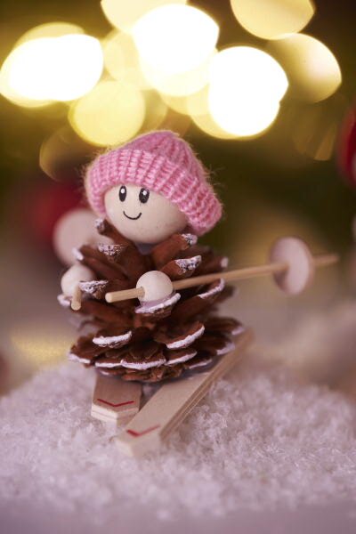 Collez les mini-bonnets sur les têtes de lutins. À l’aide d’un pistolet à colle, fixez un pompon sur le haut des bonnets. Ensuite, placez les lutins sur les skis avec un peu de colle. Enfilez les petites perles en bois sur les mini-bâtons de ski et fixez-les avec de la colle de bricolage. Les perles représentant les mains des lutins, collez-les aux cônes avec un pistolet à colle.