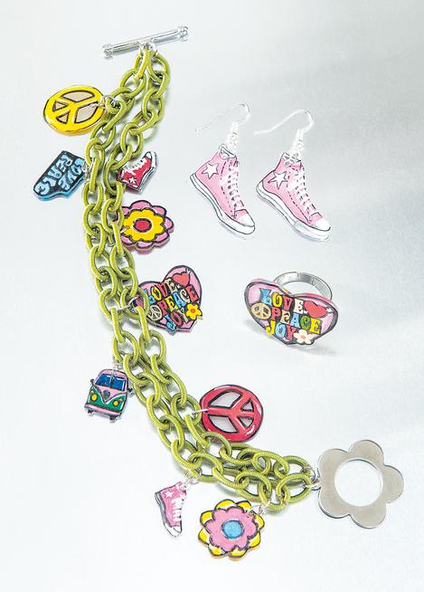 Découpez les motifs et estampez un petit trou dans chacun d'entre eux pour pouvoir par la suite y enfiler un anneau ouvert. Placez à présent les motifs en plastique dingue dans un four préchauffé à 175°C.
