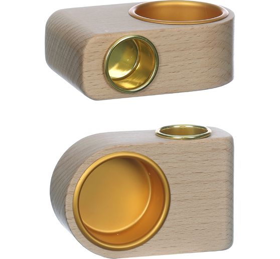 Découvrez la polyvalence de notre élégant bougeoir en bois brut avec des inserts dorés ! Cet élégant bougeoir vous permet d'utiliser soit une bougie chandelle soit une bougie chauffe-plat. D'un diamètre intérieur de 2,2 cm pour les bougies chandelles et de 4 cm pour les bougies chauffe-plat, il s'adapte de manière flexible à vos envies de décoration.