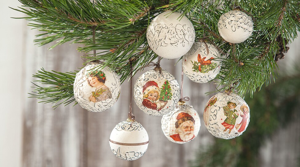 Déchirez les motifs de serviette et collez l’unique couche imprimée de chacun d’entre eux dans les insterstices. Fixez ensuite du ruban organza autour des boules grâce à du Tape-Band.