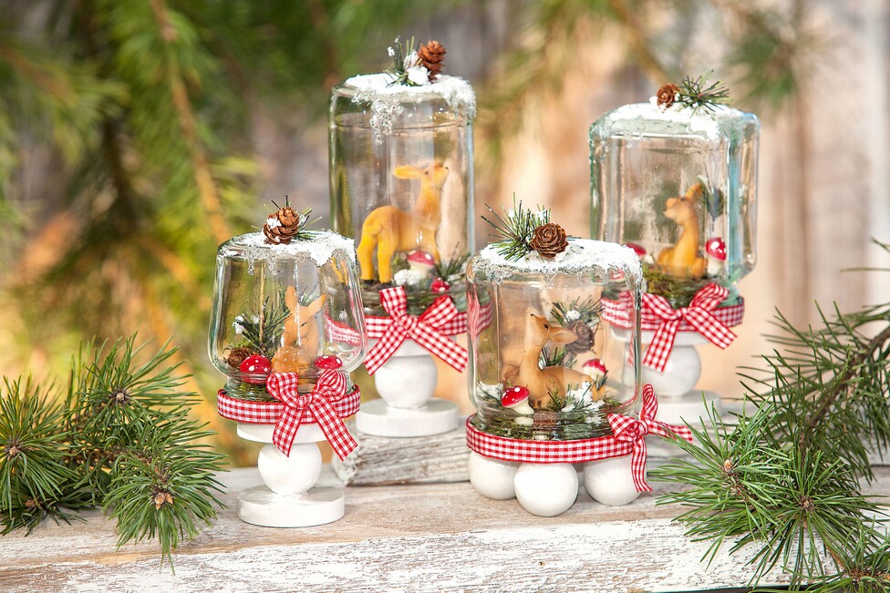 Nettoyez les bocaux et essuyez-les bien. Pour fabriquer le socle, enfoncez une petit morceau de baguette en hêtre dans le disque en bois, enfilez-y une boule puis à l’aide du marteau, enfoncez un second disque. Peignez les boules et disques en bois en blanc et laissez sécher. Collez le couvercle à pas de vis bien centré sur le socle ou bien simplement sur quatre boules en bois. Collez les rondelles d’écorce les unes sur les autres, décorez-les de mousse en plaque, de la pique de pommes de pin et de champignons puis fixez une figurine faon par-dessus. Vissez les bocaux sur les couvercles, collez un ruban à carreaux sur leur rebord et terminez par un nœud. Tamponnez de la neige décorative sur les bocaux, appliquez du médium stalactite, laissez sécher puis fixez à chaud un morceau de pique de pommes de pin. C’est terminé !