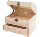 Ce coffre en bois brut permet de ranger toutes sortes d'objets et de bijoux, précieux ou non. Le corps est pourvu à la base d'une tiroir avec une façade en trompe-l'oeil, car il donne l'illusion d'avoir 2 tiroirs. Avec dormant frontal chantourné. Le couvercle a un fermoir en laiton.