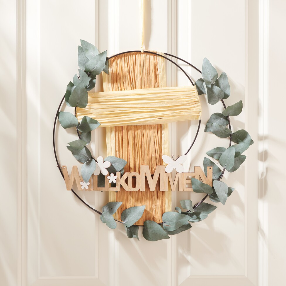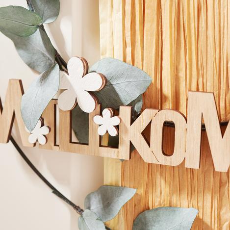 Place l'inscription "Bienvenue" sur les anneaux et fixe-la également avec du fil de fer. De cette manière, elle est bien fixée au bon endroit dans la décoration.