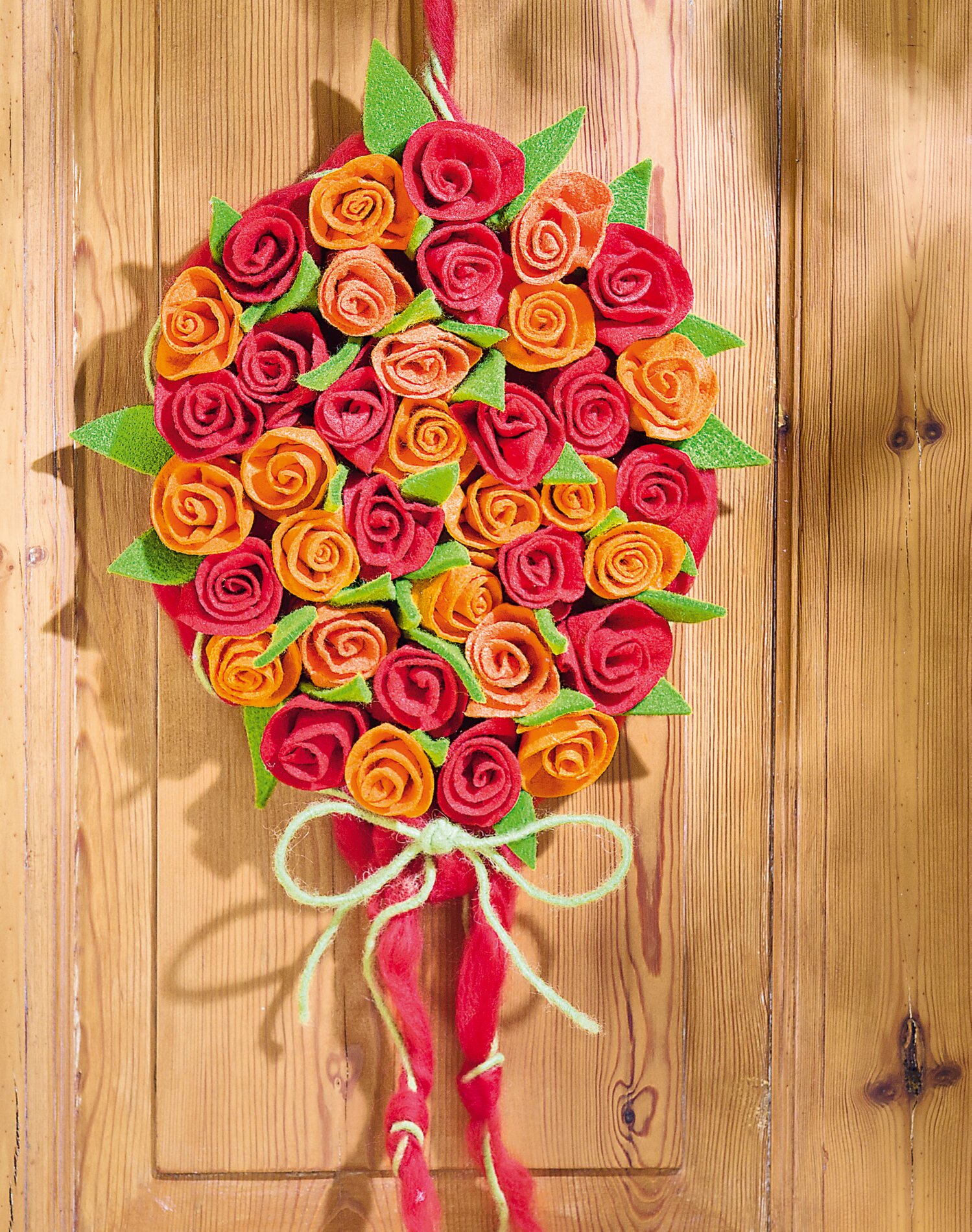 Une fois la colle bien sèche, découpez des formes de feuille dans de la feutrine Verte et collez-les entre les roses.