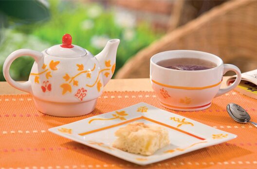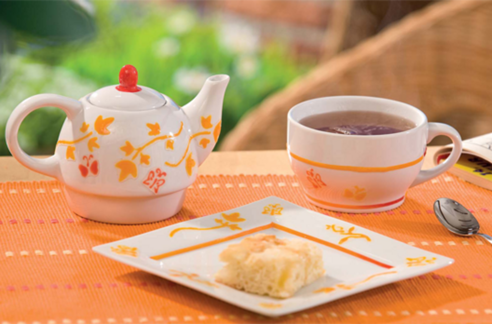Cette théière pratique assortie à sa tasse a été décorée à l'aide d'ornements en filigrane qui sont résistants au lave-vaisselle après cuisson au four...