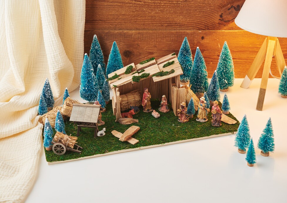 Une fois que votre structure de crèche est en place, vous pouvez commencer à fixer les éléments décoratifs. Collez maintenant la crèche, la charrette de paille, la mangeoire, les ballots de paille et les sapins aux endroits souhaités. Il n'y a pas de limite à votre imagination - créez le paysage à votre goût. Placez ensuite les personnages pour donner vie à la scène.