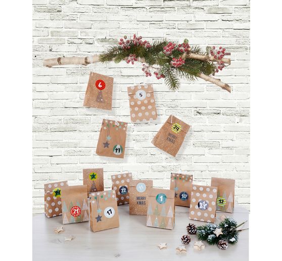 This Advent Calendarset " " isNaturea great mix of 24 kraft paper bags with 4 motives, 7 m narrow Cord in white and 24 stickers with numbers. The paper bags are about 10 cm wide, 17.5 cm high and 5.5 cm deep. You will receive 6 bags per motif.