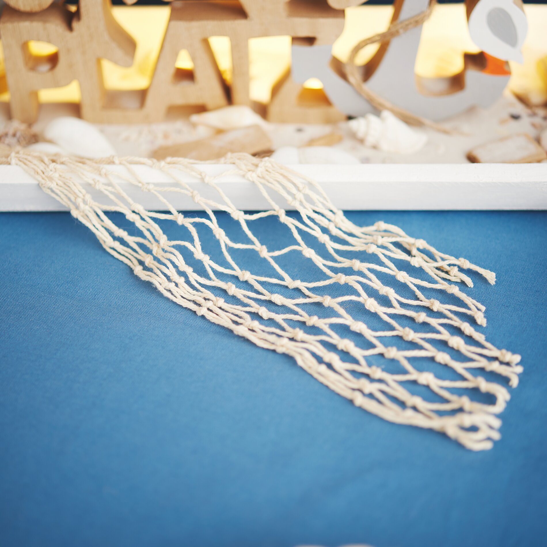 Attach the fishing net ribbon to the edge of the tray to complete the nautical theme.