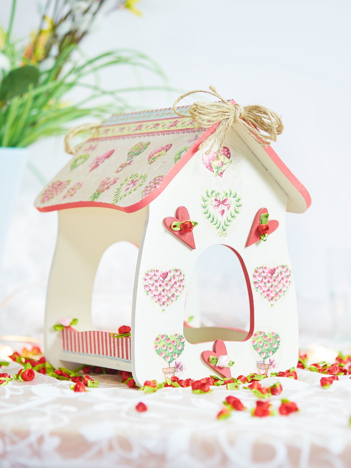 The roof and the side walls are now painted with Napkin technique ornamented. Paint the Bird feeding house wooden edges in red Handicraft paint and finally arrange little red hearts (paint wooden hearts with red paint), satin florets and Jute ribbon as decoration on the cottage.