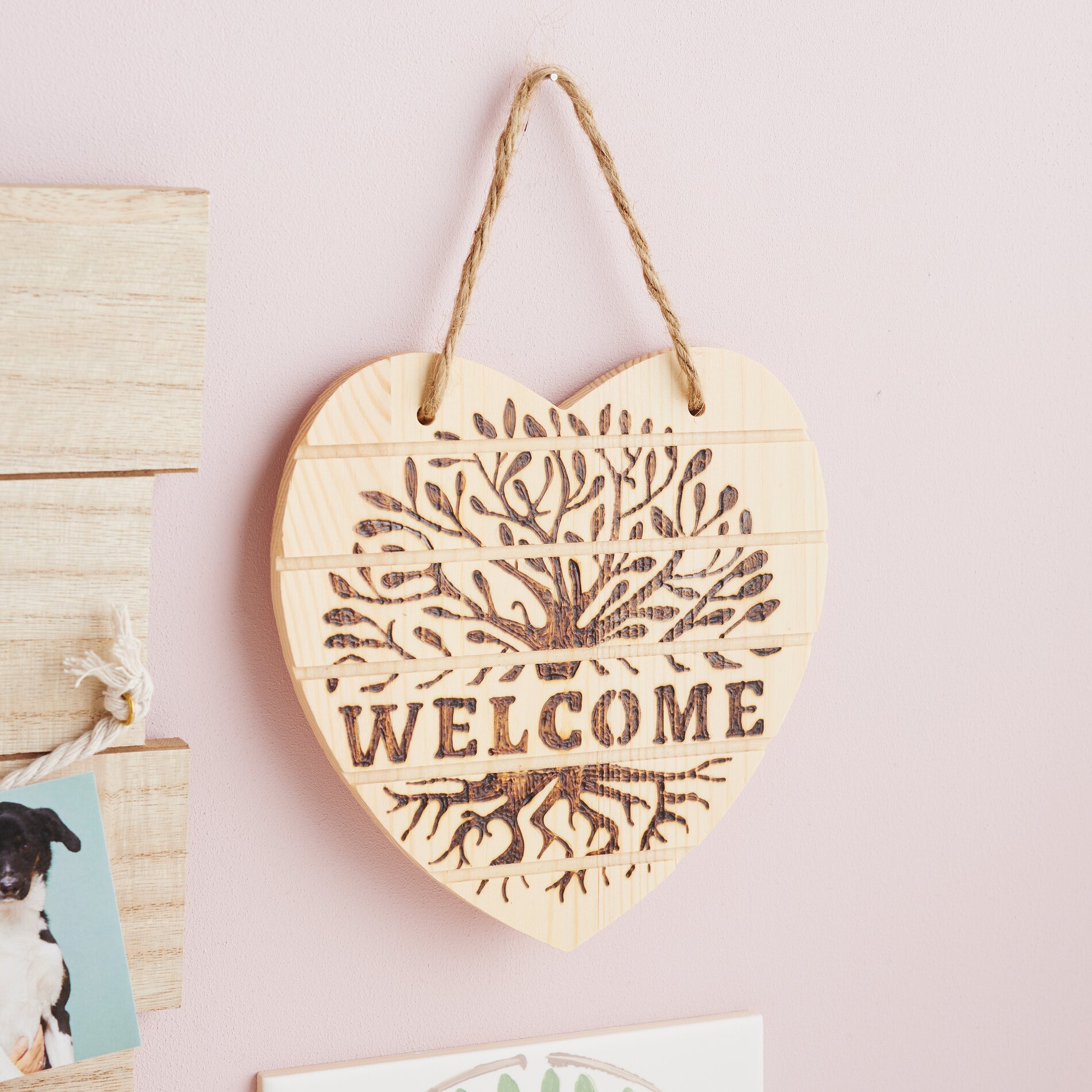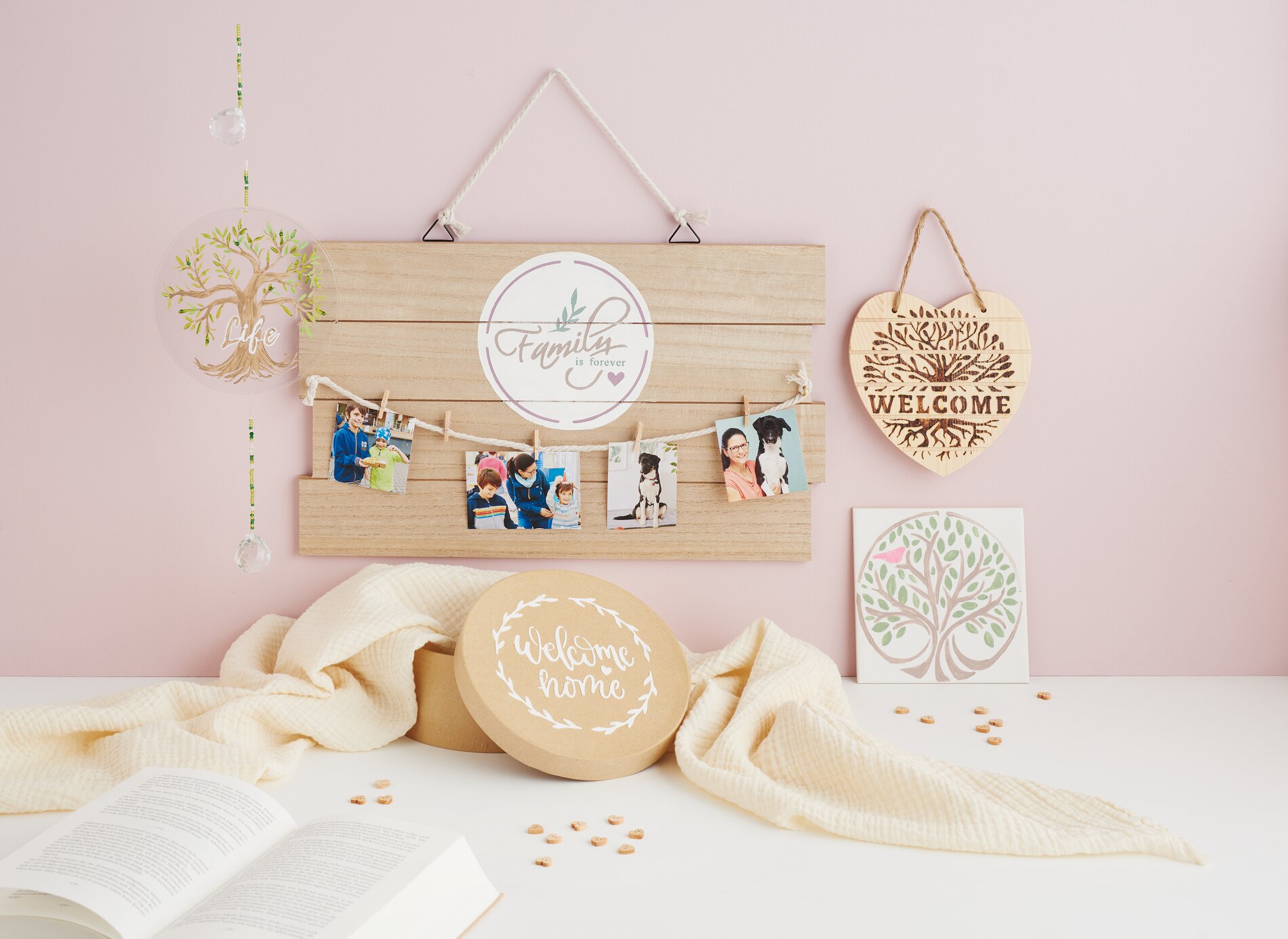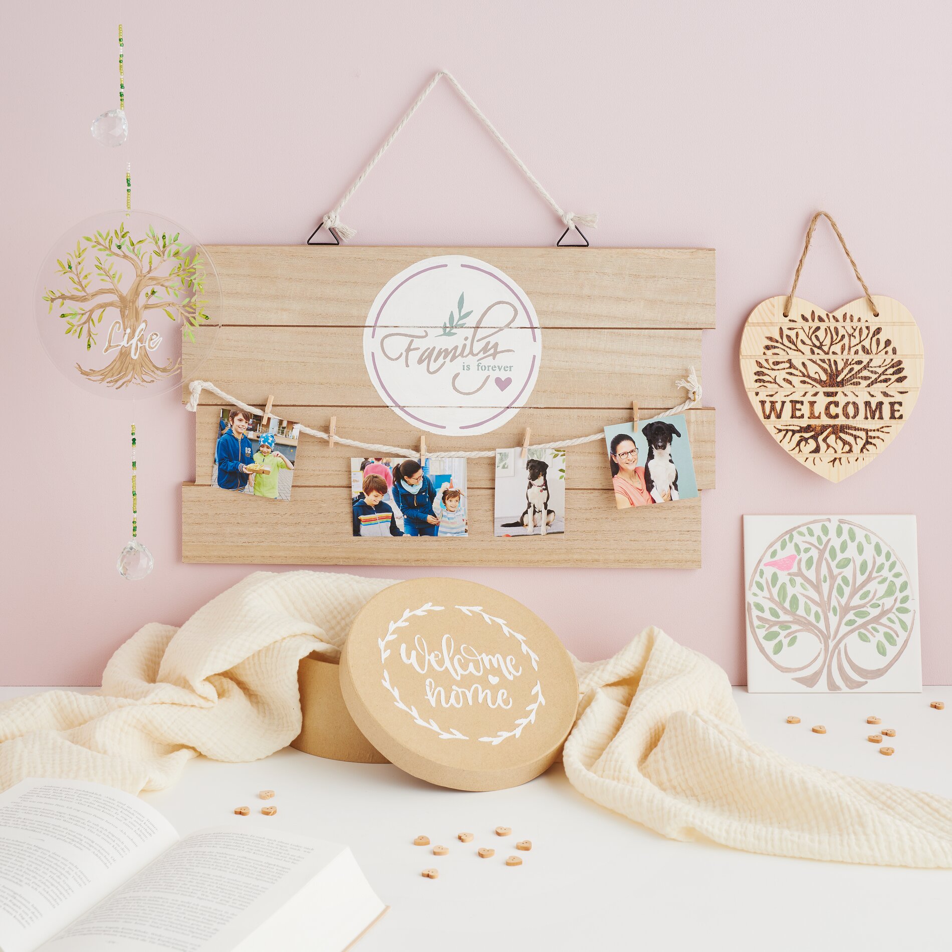 To create the family board as shown in the illustration, screw 2 eyelets into the wooden panel, attach a cotton rope to them and, if necessary, another piece of rope to the suspension. You can use small clothespins to decoratively attach photos or cards.