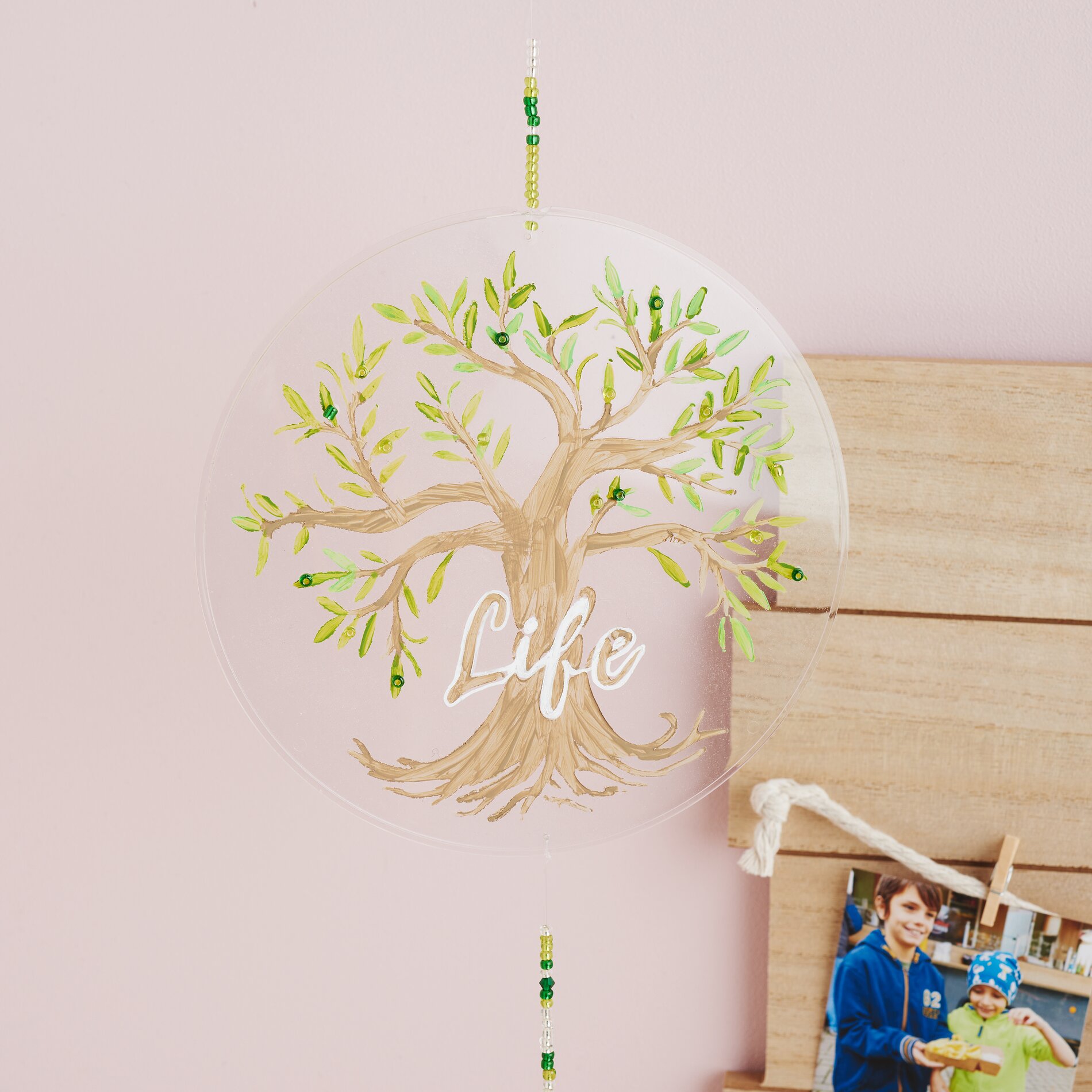 Drill a small hole in the acrylic disc. using a hand drill. Thread rocailles (small glass beads) and the suncatcher onto a Perlon thread and tie it to the disk.