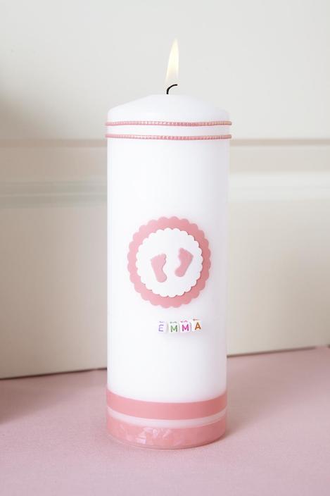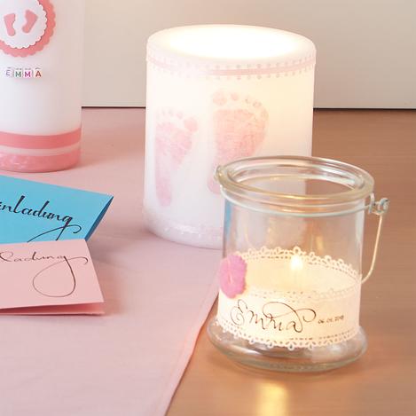 Design candles with Decorating wax, stick real wax candles with "Baby"-Napkins or transform a glass lantern with decorative ribbon and LED tea light into a name light - for our darlings only is the most beautiful light good enough!