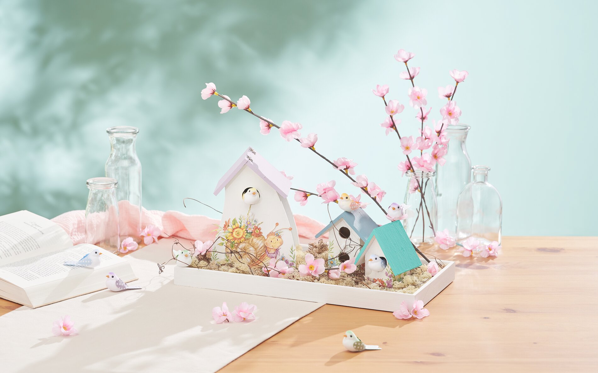 Step 1: Primer First paint the tray, the decorative birdhouses and a sheet of embossing foil with white handicraft paint and leave to dry. This light-colored primer ensures that the other layers of paint and patterns applied are shown to their best advantage. Step 2: Apply napkin technique to embossing foilOnce the handicraft paint has dried, apply a thin coat of napkin varnish. to the embossing foil. napkin technique allows you to transfer fine patterns and designs to different surfaces. Take the top, printed layer of a napkin and place it on the embossing foil treated with varnish. Coat the applied napkin motif again with a thin layer of napkin varnish. This fixes and seals the napkin layer to hold it in place. Allow everything to dry thoroughly.Step 3: Model the embossing foilTurn the embossing foil onto the VBS Special mat (or a similarly soft surface) with the treated side facing down. You can now gently emboss patterns and structures into the back of the embossing foil using embossing pens. This embossing technique gives the design a fascinating feel and depth.Step 4: Cutting out and attaching the motifsCut out the embossed foil motif carefully. To attach it to the decorative birdhouses, apply handicraft glue. to the edges of the motif, place it in the desired position on a birdhouse and press it on lightly. You can attach other motifs from napkin directly to the birdhouses without embossing foil.Step 5: Add color accentsPaint the roofs of the birdhouses with different craft colors of your choice to give the decoration additional vibrancy and your personal style. Step 6: Arrange the table decorationLay out the tray decoratively with Iceland moss, which forms a natural base. Place the decorated birdhouses on top. Trim the cherry blossom branch with a side cutter and place it artfully on the tray, finishing by attaching small decorative birds to the cherry blossom branch with hot glue. These cute details give the entire decoration a perfect charmGet creative now! Ready to start your creative craft project? Visit our online store to order all the materials and tools you need for this fantastic project DIY-Project. Immerse yourself in the world of handicrafts and create your very own garden decoration. Have fun crafting!
