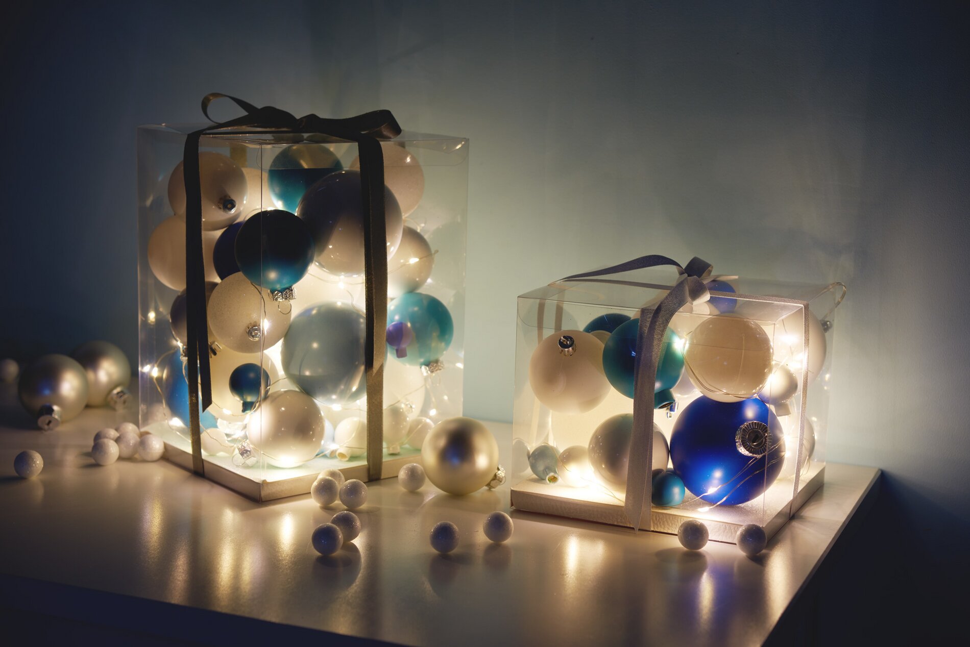 You will need Christmas balls in different sizes for this idea. Select a part of the balls and spray them with color spray in harmonious matching colors (for this idea we have used three shades of blue). The baubles spray best when held on a bamboo skewer while doing this.