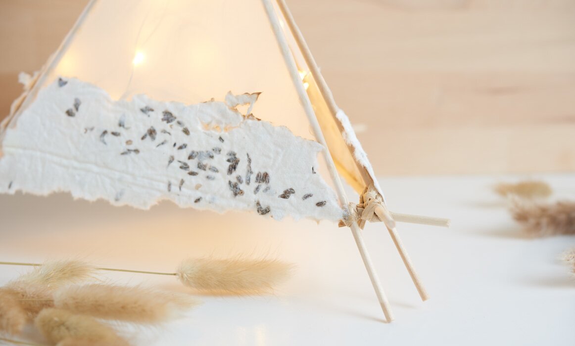 For a "teepee" lamp you will need 2 sheets of cellulose. Tear them into small pieces, soak them in a tub of warm water, and blend everything into a pulpy mass. To create a unique look, add dried flowers. Go into the mixture with the entire paper scoop frame, swaying the frame back and forth slightly so that the frame surface is evenly filled with the paper mixture.