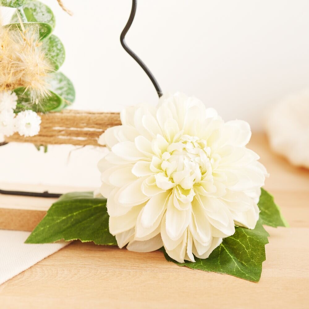 Stick the plants decoratively into the jute ribbon. Test different arrangements until you have achieved a harmonious overall picture. They can also be fixed in place with a few hidden drops of hot glue. If desired, arrange a single larger flower on your new Easter decoration as the icing on the cake.
