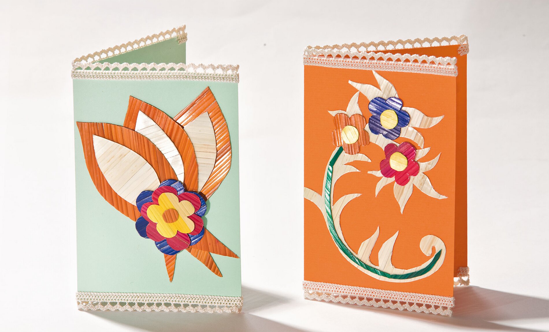 If you want to obtain large areas, you can fix the flat stalks close together on crepe-Adhesive tape . If the plates become slightly wavy, you can press them between two heavy books. When this is done, draw the desired shape on the back and cut it out with scissors. The crepe-Adhesive tape allows you to cut the straws without tearing at the edges