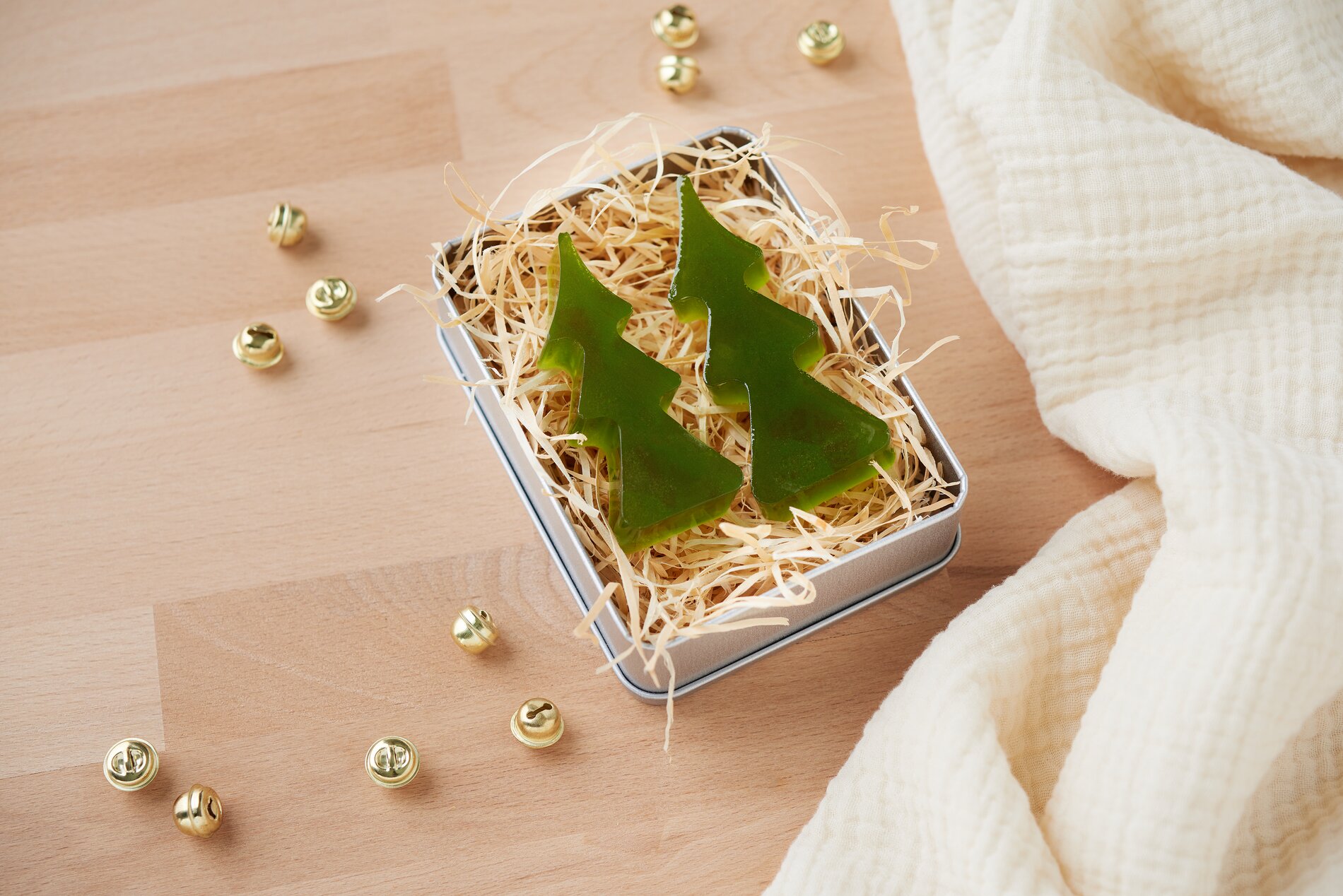 Once the soap is solid, carefully remove it from the Christmas tree silicone mould. For a particularly attractive presentation, you can place the soap in a metal tin with some wood wool. This pretty packaging protects the soap and makes it the perfect Christmas gift.