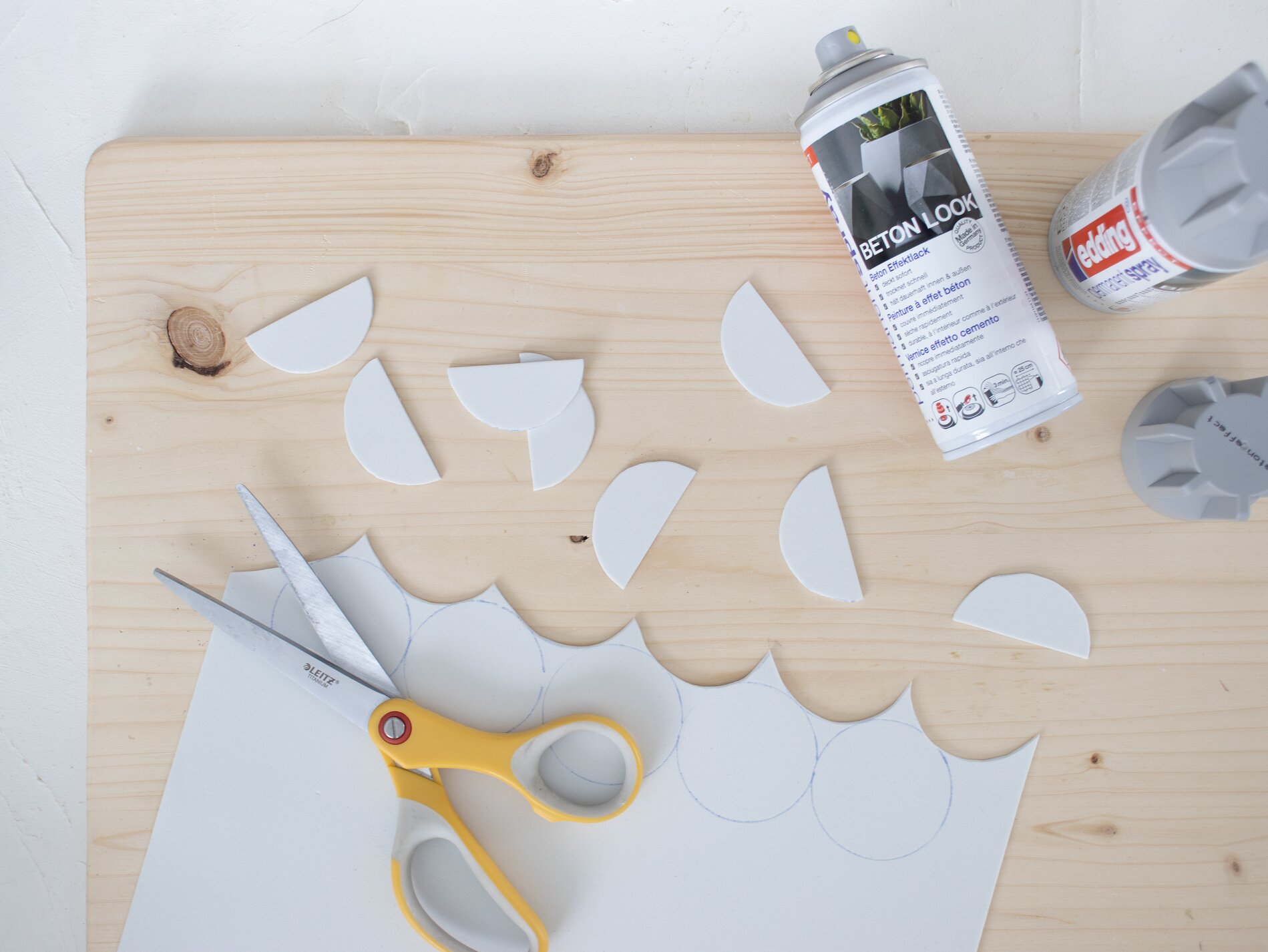 Make a stencil from Paper . For these instructions, a circle with a diameter of 5 cm was used and then divided in the middle. Trace the outline of the semicircle with a pencil on the foam sheets and cut out all the semicircles as precisely as possible using scissors.
