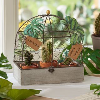 The decorative aviary "Shabby" has a length of about 25 cm, width 14 cm and height 29 cm. With hinges for opening the wire basket. The inner dimensions from of the wooden box are approx. 23.3 cm long x 12.3 cm wide x 5.5 cm high.