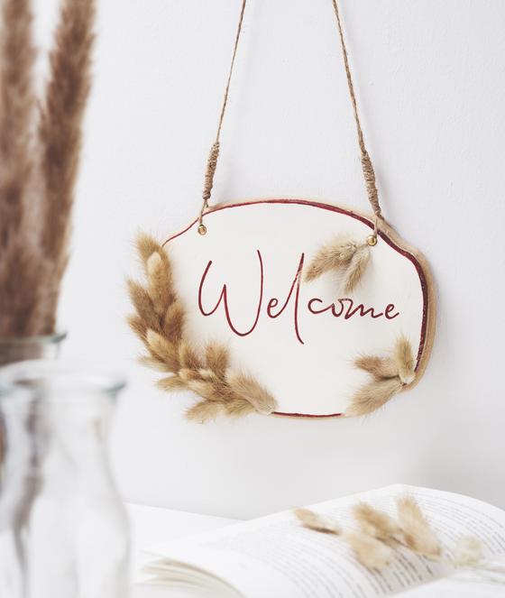 Now place the finished sign on the wooden plate and then glue on the dried flowers using hot glue. Then attach the cord. The holes can be closed with pattern bag clips. This looks particularly beautiful.
