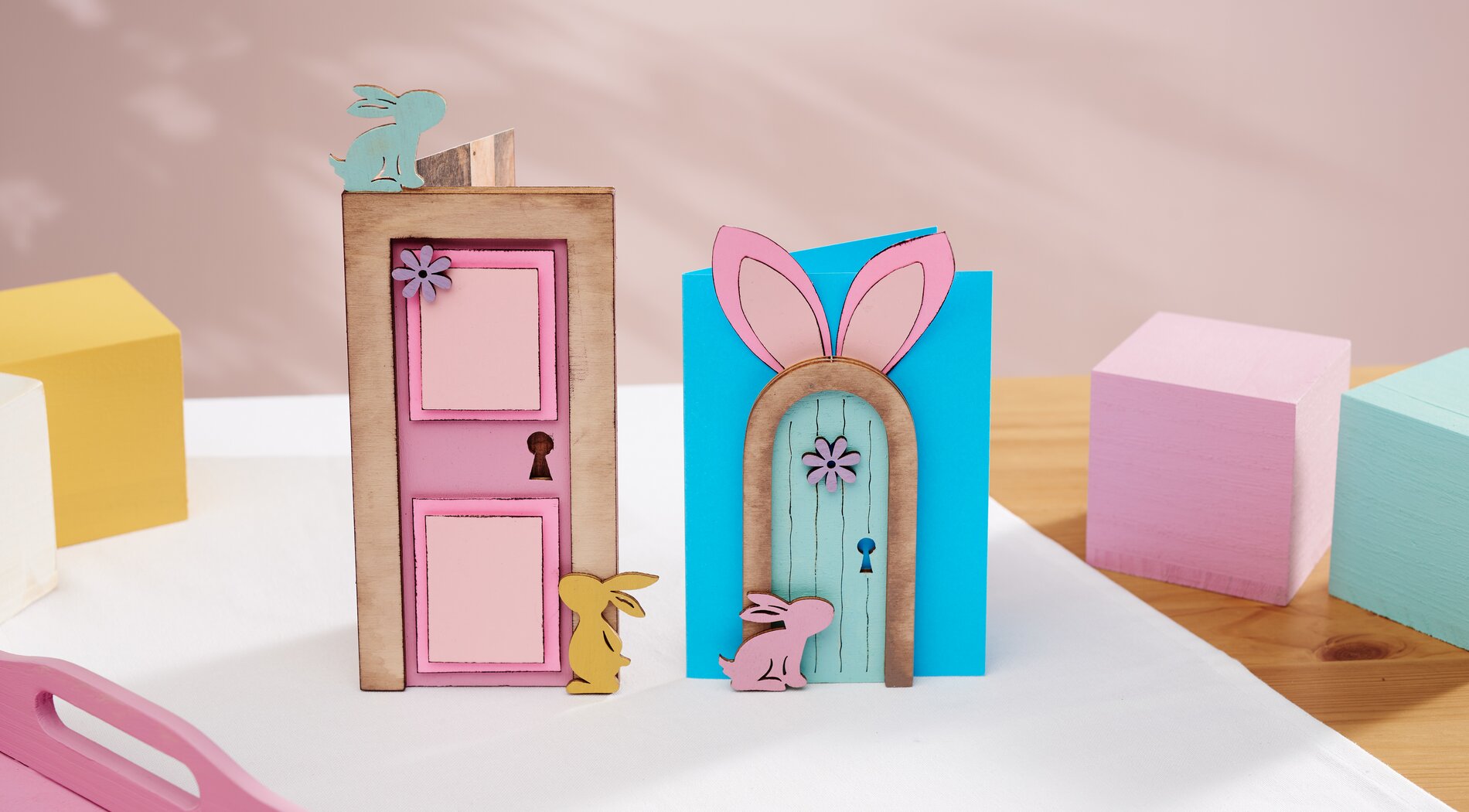 For the door with the bunny ears, cut out the ears and inner ears from a selected paper and glue the parts on top of each other. Now fix both doors and the ears to the cards.