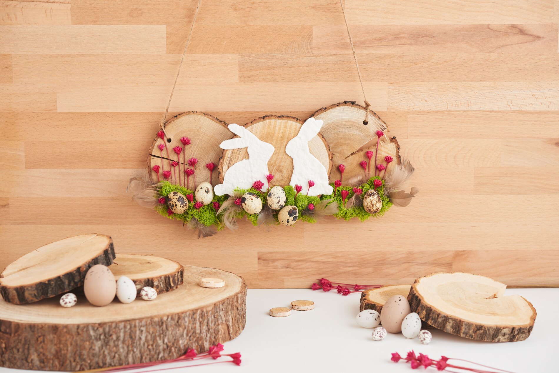 Glue Iceland moss, small flowers, goose feathers and quail eggs onto the wooden discs for a unique design.