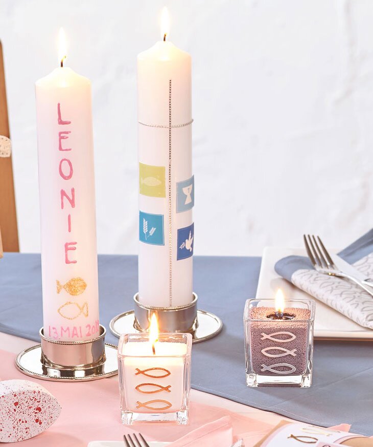 With decorative wax plates, strips and a candle pen, an inconspicuous candle becomes a personal unique piece. Further motifs can be cut out of one Napkin and glued onto the candle with a candle pen. By the candle potch medium the napkin paper becomes hardly inflammable.