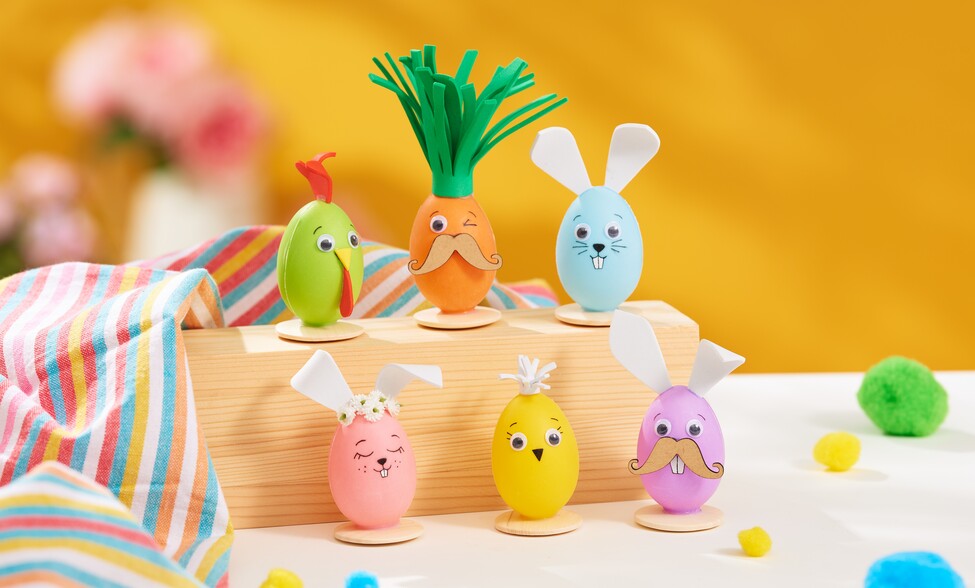 Take the templates and transfer them to the foam sheets. Carefully cut out the foam rubber shapes. foam sheets is ideal for crafting as it does not fray. Then stick the cut-out pieces of foam rubber in the desired places on the eggs.
