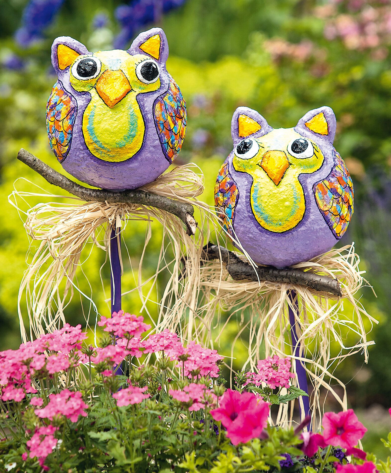 Owls are a real perennial favourite for Garden Decoration. These two colourful specimens are modelled with papier-mâché on large plastic spheres and painted with weatherproof paint. A cheerful splash of colour for your garden!