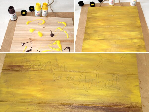 If the hemispheres are dried, you stick the bees at different places on the sign with the Handicraft glue . Between two hemispheres you should always leave a small gap for the wire or the wings
