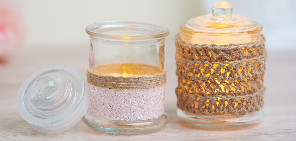 Natural-looking lanterns with an effective glittering look are quickly made by yourself. Filled with LED tea lights, the glasses are the ideal new contemporary garden decoration.