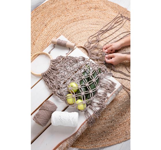 The Macramé-Cord is available in different colors. The macramé yarn has a length ofapprox. 55 m, as well as a thickness of approx. 4 mm. The Macramé-Cord has a 3-ply macramé yarn and consists of 80 % recycled cotton, and 20 % polyester.