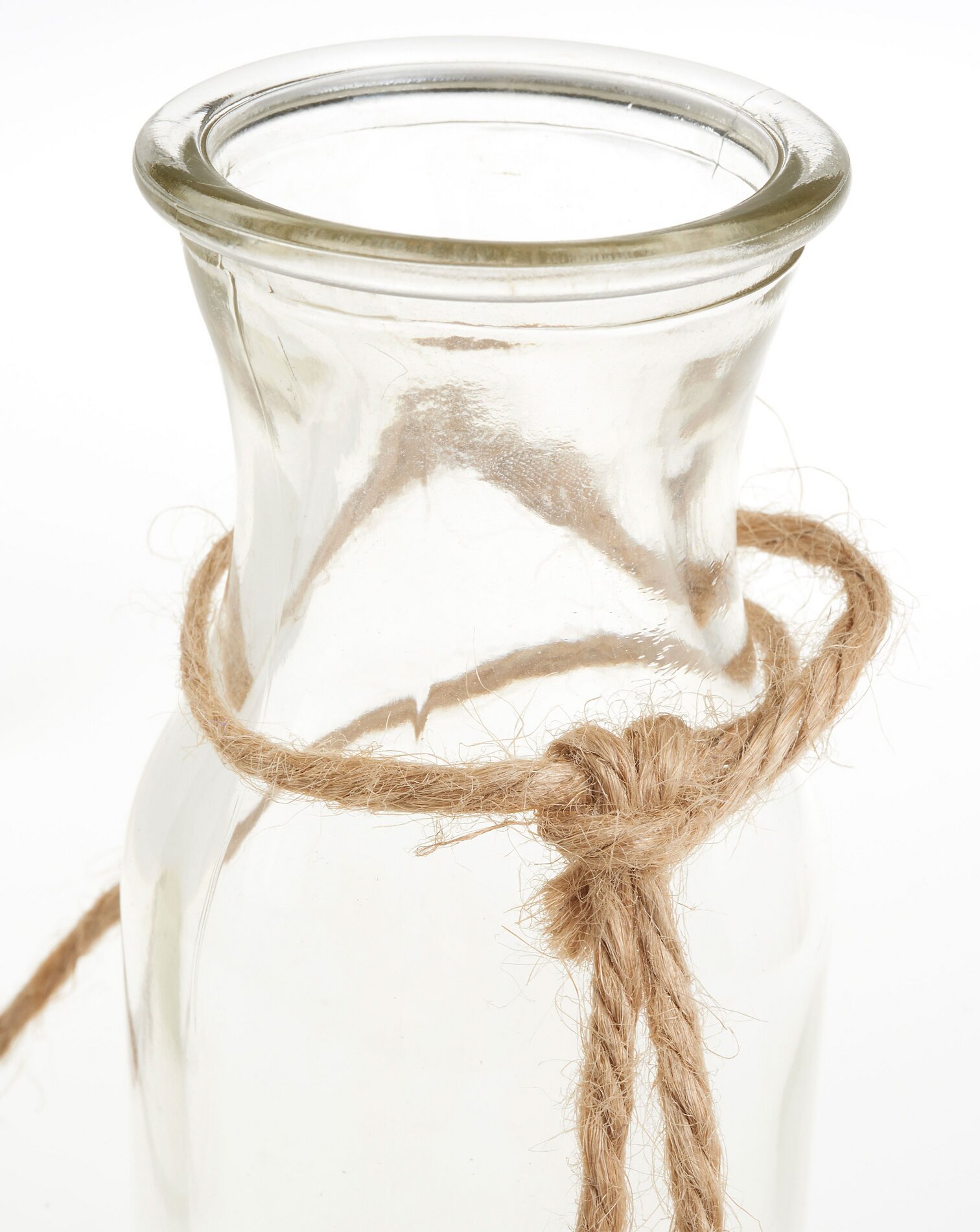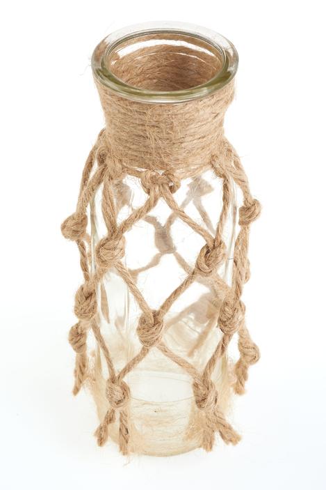 Pull the loop off the bottle and place 5 more evenly distributed knots on the loop (6 pieces in total). Glue the bottle neck with transparent double-sided adhesive Ribbon,. Put the jute loop around the bottle neck again and tighten the Ribbon of the loop. Wrap the Jute ribbon up to the edge of the bottle neck on the adhesive surface.