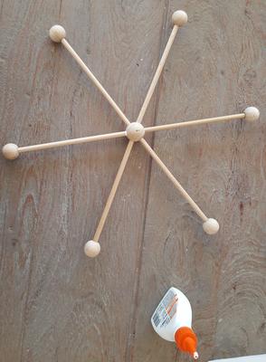 The first step is to assemble the mobile cross. The individual parts are glued together with wood glue. Place a ball at each end of the sticks. If you like, you can paint the mobile cross beforehand.