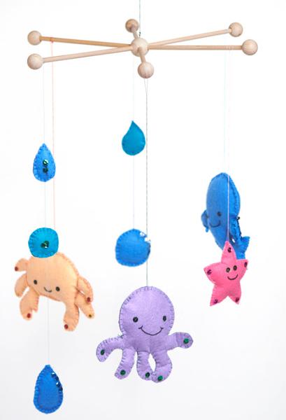 Make additional drops of water in different shapes and sizes to balance out the mobile. We make the drops from turquoise and blue felt , also in two parts.