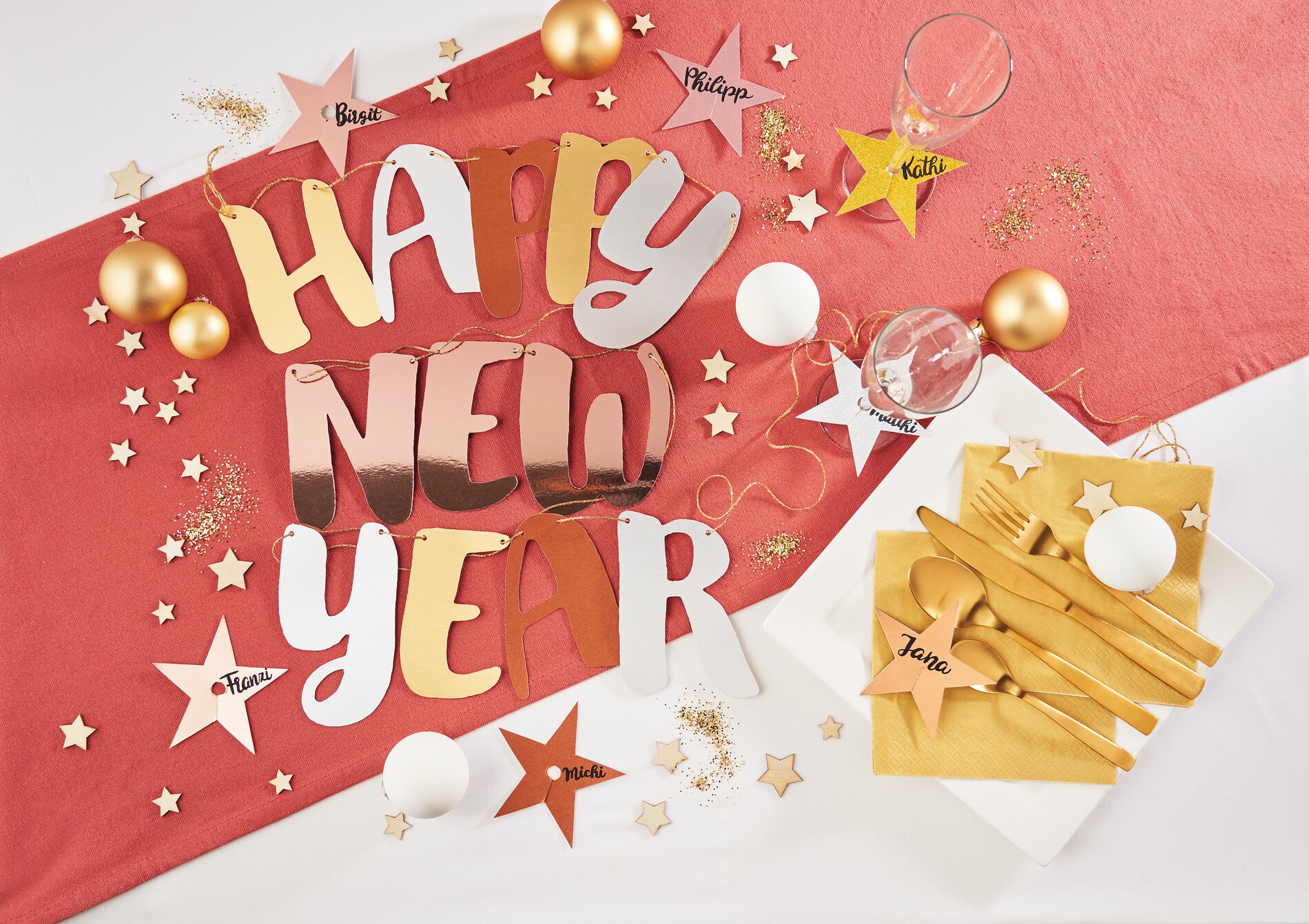 New Year's Eve is the perfect opportunity to welcome in the New Year with sparkling decorations. With our simple craft instructions, you can create a stylish 'Happy New Year' garland and useful glass markers to give your celebration that little bit extra.