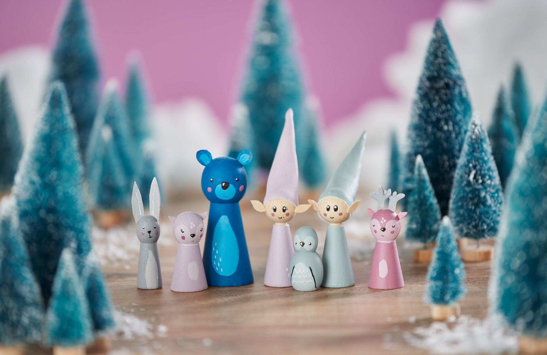 Conseils : Le collage des bonnets peut être légèrement plus long que celui des autres pièces. Nous recommandons de maintenir les bonnets pointus en forme par une pince en bois le temps que la colle prenne bien. Dessinez les visages (les yeux, les bouches, les truffes) avec un fineliner noir. Si vous n’êtes pas tout à fait sûr de vous, vous pouvez dessiner au préalable tout cela au crayon à papier sur la figurine elle-même ou sur une feuille de papier. Apportez quelques points de lumière aux regards et çà et là quelques petites touches claires avec un marqueur peinture blanc.