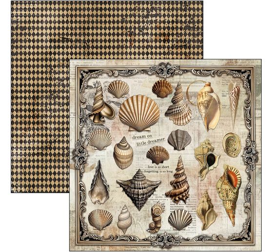 Discover the fascinating world of the Scrapbook paper "Cabinet of Curiosities" and let your creativity run wild! Printed on both sides, this motif paper inspires with a variety of designs - from butterflies and insects to compasses , sea shells , plants and anatomical drawings.