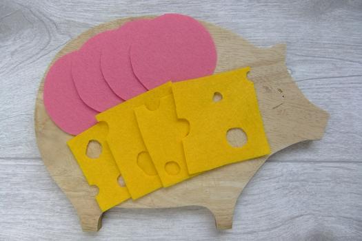 Cut out round circles from pink felt for the sausage and squares with irregular holes from yellow felt for the cheese. You can also simply use a glass or something else round as a stencil . This creates a delicious cheese and sausage platter.