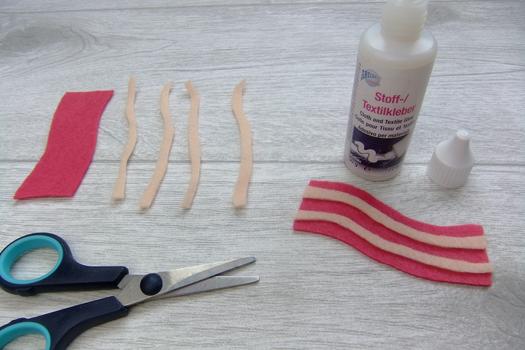 For the gloves, cut out two glove shapes from felt and enlarge them by a few cm) and a strip (approx. 1 x 6 cm) from each. Make sure they fit the size of your child's hand.