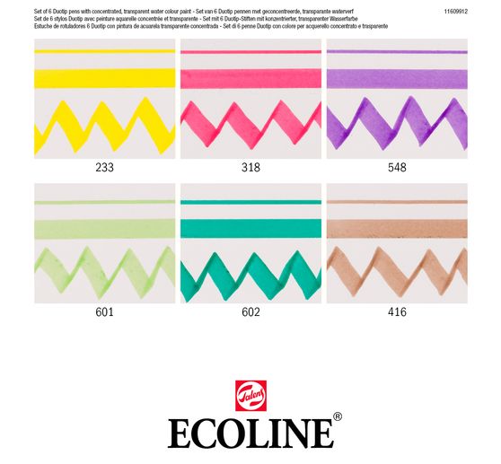Talens Ecoline Duotip "Botany-Set" with 6 markers in colors 233 chartreuse, 318 carmine, 548 blue violet, 601 light green, 602 dark green and 416 sepia. Brilliant colors that convince. The colors are based on dyes and gum arabic and contain high quality concentrated transparent watercolor paint. The markers are equipped with two different tips (a narrow ball tip and a wide wedge tip). This allows you to draw fine and wide lines or color large areas.
