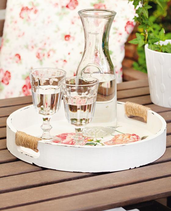 Prime the tray with the Paint sponge in white and let it dry. Cut out the flowers from Motif straw silk , place them on the tray and coat them with Napkin varnish. Wrap the handles with Jute yarn and fix the yarn ends with hot glue. Emphasize the edges with the dark color by brushing over them with the flat side of the brush.