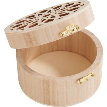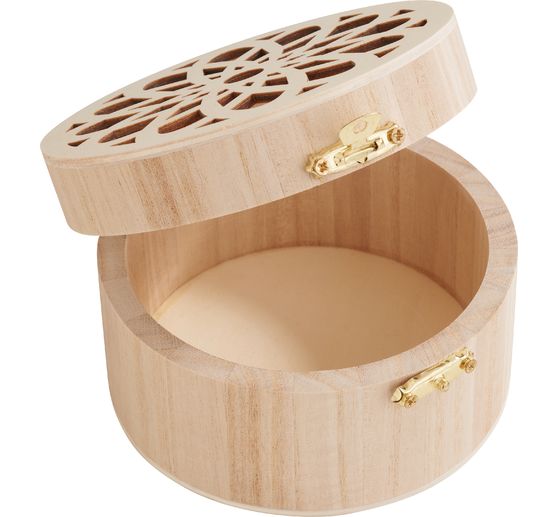 Unleash your creativity with our VBS Wooden box, round "Ornament flower"! This elegant round box with metal closure features a laser-cut flower ornament in the lid, which will add a charming atmosphere to any room. With a diameter of 10.8 cm and a height of 6.5 cm, it offers plenty of space for your little treasures or gifts.