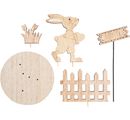 Discover the VBS Wooden building kit "Rabbit with shield" and let your creativity run wild! With this unpainted Wooden building kit you can create your own individual Easter decoration. This 5-piece set consists of a bunny, a shield, a fence and trees on a round wooden discs. With a width of 10 cm, a height of 15.2 cm and a depth of 0.5 cm, it is a true all-rounder.