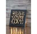 The wooden writing "Do all things with love" has a size of approx. width 18 cm x height 18 cm, thickness 3.7 mm.