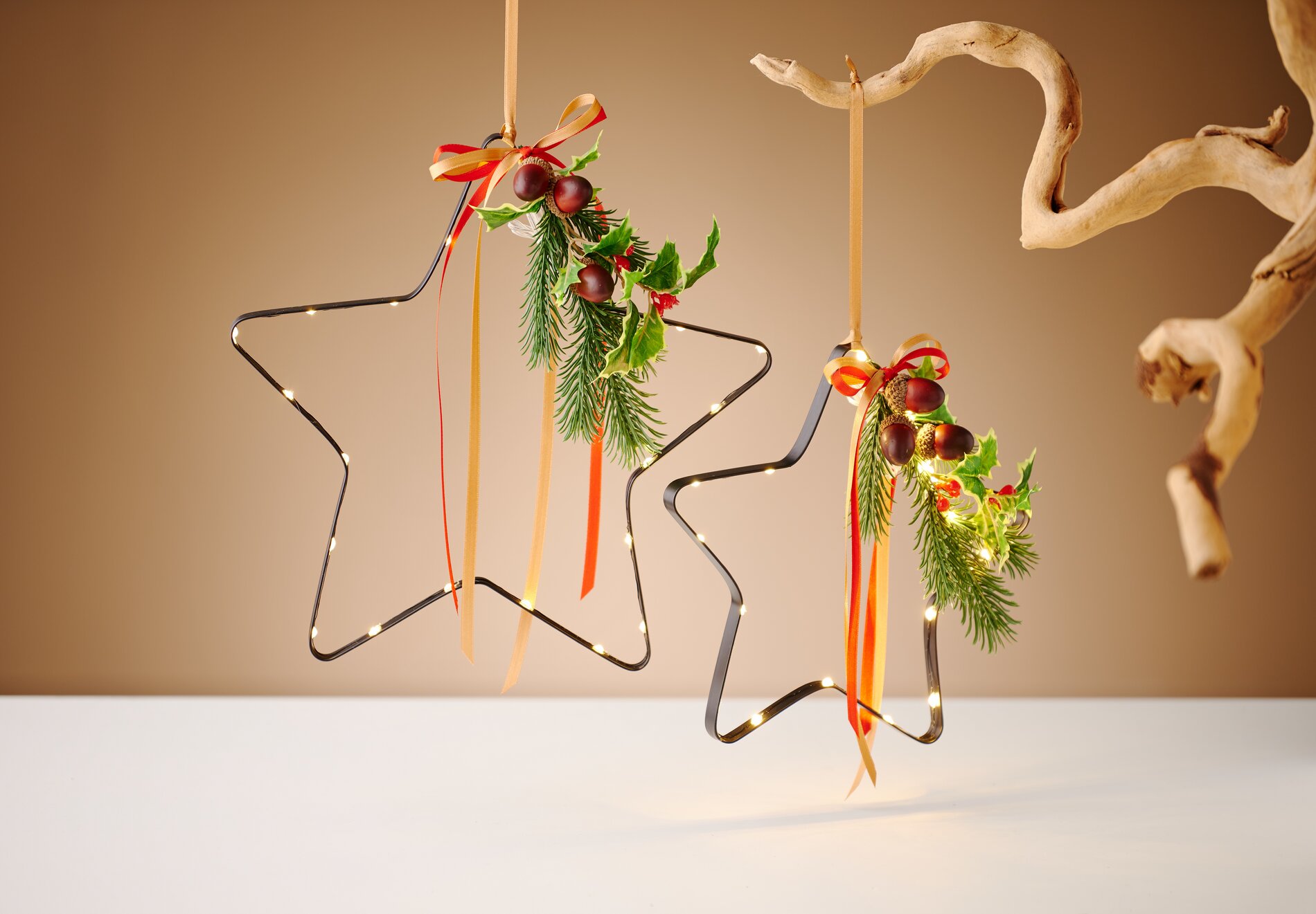 Ensuite, tu attaches soigneusement les plantes artificielles ensemble avec un ruban ou un fil de fer et tu les fixes à l'étoile avec le même ruban ou fil de fer. Pour plus de stabilité, tu peux ici aussi utiliser de la colle chaude. Assure-toi que les plantes sont bien fixées et ne bougent pas.