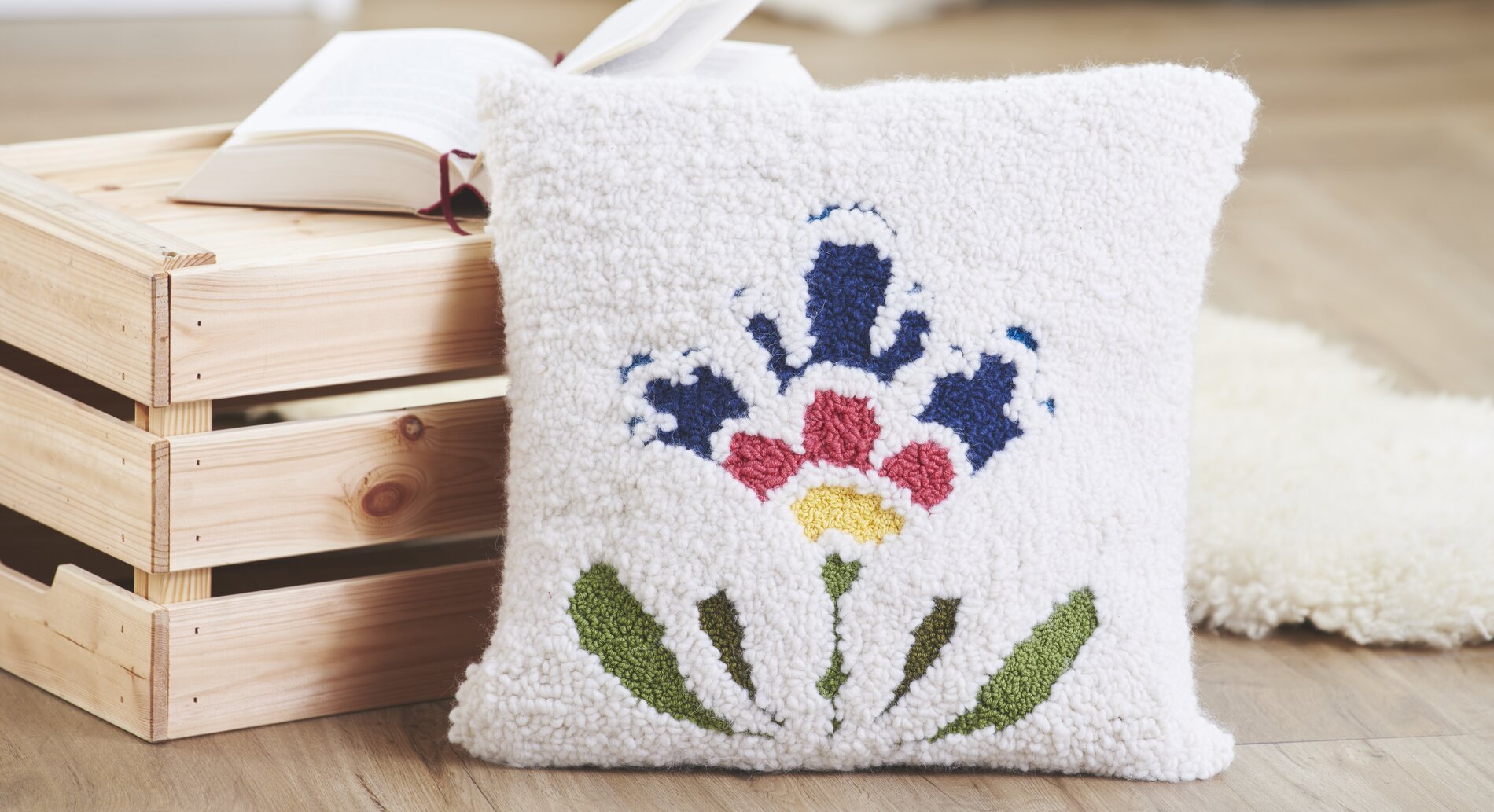 L’aspect 3D de motif se fait en créant des boucles de différentes longueurs, qui sont générées par l'aiguille Punch Needle. La longueur des boucles peut être ajustée à l'aiguille elle-même. Enfilez la laine dans l'aiguille Punch Needle en suivant les instructions. Assurez-vous que l'épaisseur de l'aiguille soit adaptée à celle de la laine. Maintenant, vous pouvez poinçonner votre motif sur le tissu. Enfoncez l’aiguille complètement dans le tissu, la fente vers le côté où vous souhaitez avancer.