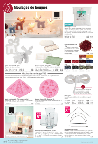 Moule en silicone %u00ab Vide-poches %u00bbPr%u00e9voir env. 80 ml (Petit) et 300 ml (Grand) de mat%u00e9riau.PetitL 15 x l 11 x H 2 cm41262 4311,99GrandL 26,4 x l 15,1 x H 2,2 cm41262 4419,99Granul%u00e9s color%u00e9s en cire, 40 g1-2 cuill%u00e8res %u00e0 soupe suffi sent pour colorer env. 500 g de cire. Plus vous ajouterez de granul%u00e9s et plus intense sera la couleur.chaque couleur2,491kg=62,25Moule en silicone VBS %u00ab Trio de sapins de No%u00ebl %u00bb3 empreintes d'env. H 4,1 cm, 5,2 cm et 7,1 cm. Convient pour le candle liner et les p%u00e2tes %u00e0 modeler.41269 422,49M%u00e8che platePour des bougies de %u00d8 8 cm, %u00d8 4 cm et %u00d8 2 cm respectivement.3 x 22 mm1,5 m41500 1041,691m=1,133 x 14 mm3 m41500 0811,791m=0,603 x 9 mm4,5 cm41500 0741,991m=0,44Aiguilles %u00e0 coudre, set de 6Contenu: 1 aiguille pour la maroquinerie et le jean, 2 aiguilles pour les travaux de tapisserie et les peluches, 1 aiguille %u00e0 tapis, 1 aiguille pour les paniers, les nattes et les sacs, 1 aiguille pour les toiles, tentes, voiles, auvents ou chaises longues.41620 0863,79Moule en silicone VBS %u00ab %u00c9lan %u00bb%u00c9paisseur des %u00e9lans : env. 2 cm.Petitl 4,4 x H 6,6 cm41269 403,49Grandl 5,9 x H 9,2 cm41269 396,99NOUVEAUM%u00e9lange pour bougiesM%u00e9lange pr%u00eat %u00e0 l'emploi compos%u00e9 de 80 % de paraffi ne et de 20 % de st%u00e9arine, qui donne une belle couleur blanche, am%u00e9liore les propri%u00e9t%u00e9s de combustion et prolonge la dur%u00e9e de combustion. Peut %u00eatre teint%u00e9 avec des colorants et parfum%u00e9 avec des huiles.%u00e0pd. 1 pc.41274 5114,491kg=14,49%u00e0pd. 3 pc.41274 5113,041kg=13,04set de 6379T%u00e9l : 03 69 61 69 10 (num%u00e9ro non surtax%u00e9)10 |e-mail : service@vbs-hobby.frTous les prix sont en %u20ac TTC.Cr%u00e8meJaune41500 654 2141500 654 06RougeRoseVioletBleu fonc%u00e941500 654 0541500 654 2241500 654 0941500 654 07Bleu clairVertVert clairGris41500 654 2341500 654 0341500 654 2441163 16 Moulages de bougies Exemple de d%u00e9corationExemple de d%u00e9coration avec Tron%u00e7ons de bois VBS p. 12.Fiche3470Fiche3471Passez la m%u00e8che dans une aiguille et enfoncez-la dans le fond du moule en silicone. Pour retirer l'aiguille, utilisez une pince %u00e0 bijoux.Verres %u00e0 bougie chauffe-plat VBS, set de 42 verres d%u2019env. %u00d8 bas 4,5 x %u00d8 haut 5,5 x H 6,5 cm, 1 verre d%u2019env. %u00d8 bas 4,8 x %u00d8 haut 6 x H 8,5 cm, 1 verre d%u2019env. %u00d8 bas 5,1 x %u00d8 haut 7 x H 10,7 cm. En verre transparent r%u00e9sistant.41686 1985,49set de 4549Moule en silicone VBS %u00ab Christmas Mix %u00bbEnv. %u00d8 7 cm. 8 empreintes. Convient pour le candle liner et les p%u00e2tes %u00e0 modeler.41269 472,69Les moules de modelage VBS conviennent parfaitement au Candle Liner (R%u00e9f. 41 490 559-..) et aux p%u00e2tes %u00e0 modeler (comme par exemple la Cream Paste - R%u00e9f. 41 108 59) disponibles sur vbs-hobby.fr. Moules de modelage VBS